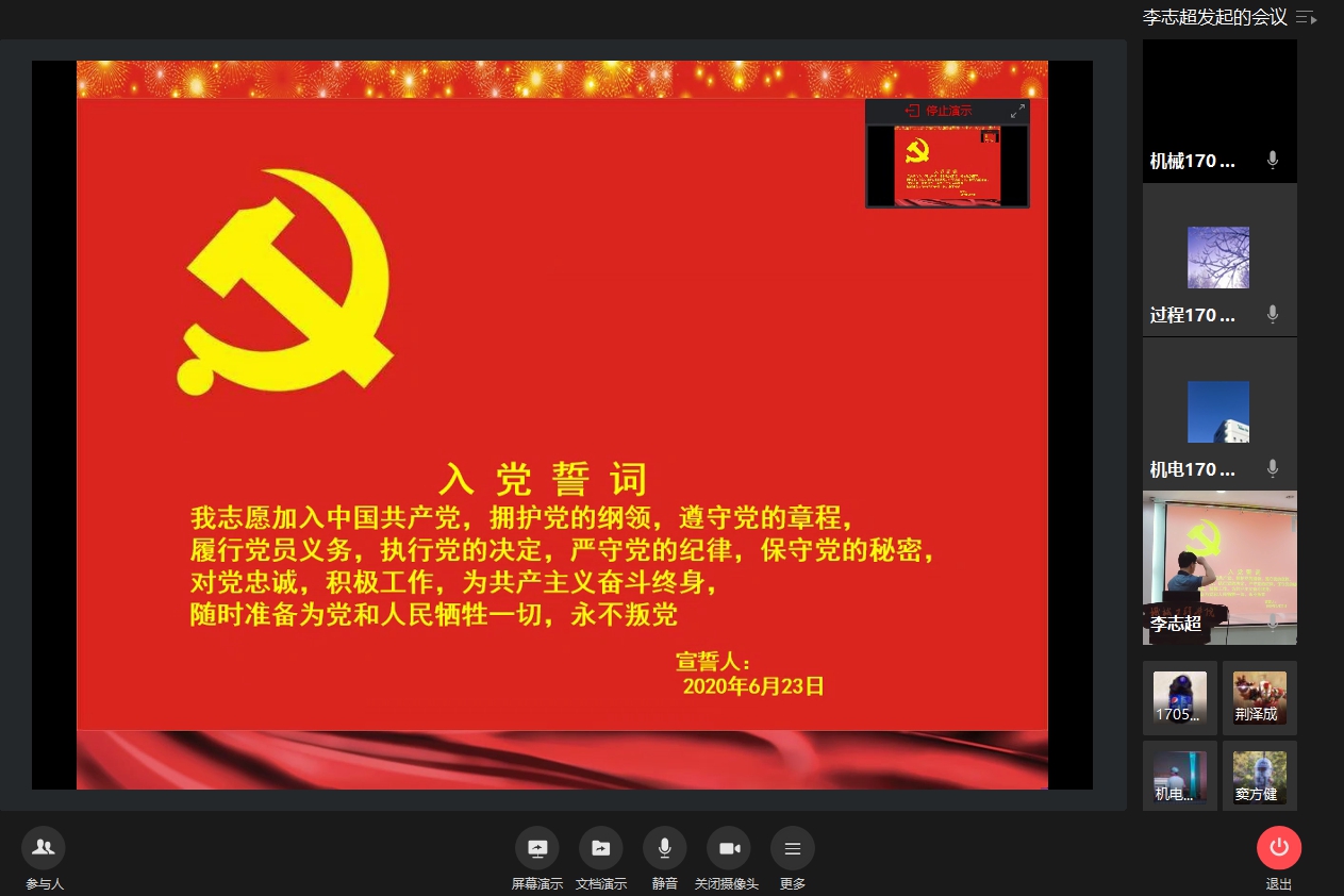 C302会议室和湖北、湖南、辽宁、山东、江西、河南、重庆、安徽、浙江、江苏等10省多地举行。学院党委书记高雪梅,党委副书记、副院长方俊及在校新党员出席仪式。宣誓仪式由辅导员李志超主持。