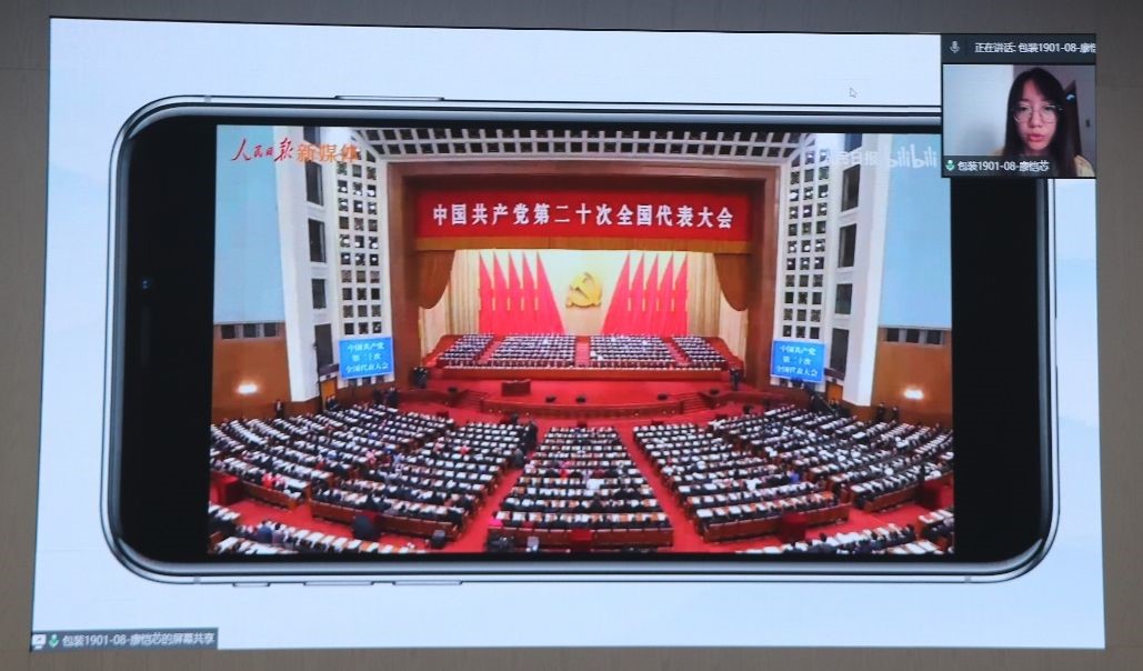 首先,廖恺芯带领在场学生通过视频回顾习近平总书记在二十大中振奋人心的讲话。接着,她以生逢其时开篇,重点介绍了从党的十八大开始,以习近平同志为核心的党中央采取的一系列战略性举措,推进的一系列变革性实践,实现的一系列突破性进展,取得的一系列标志性成果,团结带领人民推动党和国家事业取得了历史性成就与变革。随后,廖恺芯向大家生动展示了利比亚撤侨、大国工匠邹彬、西藏军区“墨脱戍边模范营”巡逻官兵等事例,指出,我们学生应以榜样为例,勇担重任,以志为先、以新为径、以苦为食。最后,廖恺芯提出,作为时代新人,应做到坚定信念,坚守伟大理想;甘于奉献,担当历史责任;永久奋斗,勇立时代潮头;自立自强,创造崭新奇迹。