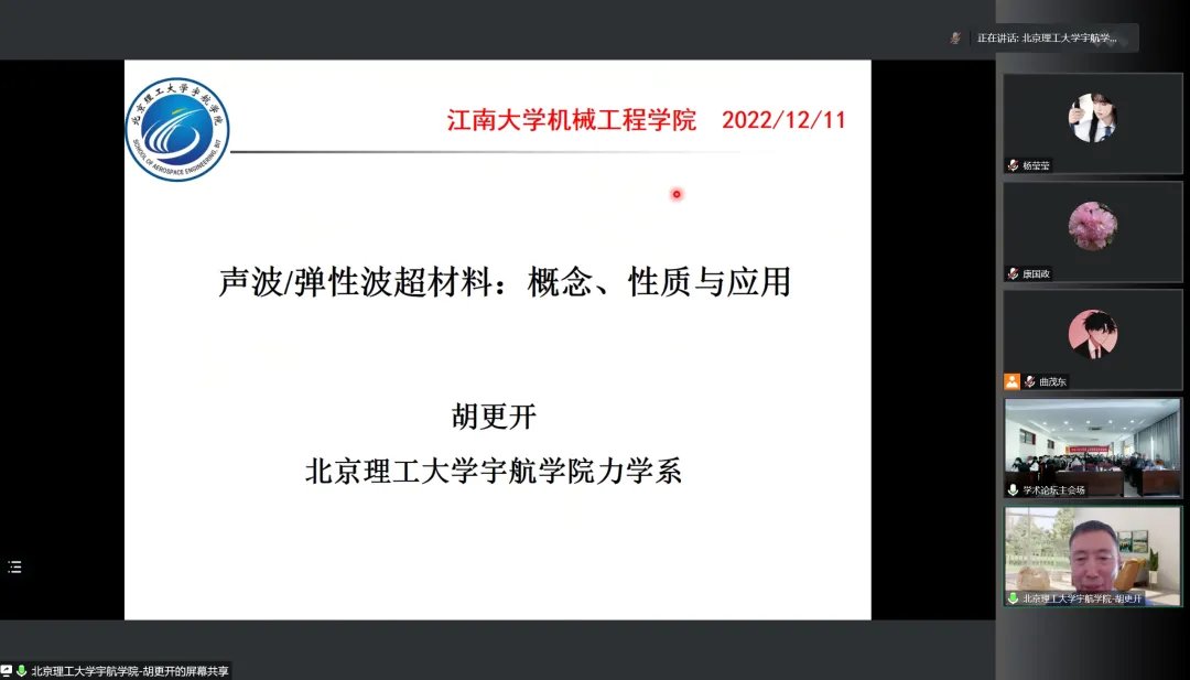 开幕式结束后,开始线上加线下特邀专家学术报告会,上海交通大学谷国迎教授作题为“软体机器人技术研究进展”的学术报告,华中科技大学廖广兰教授作题为“芯片封装缺陷检测技术”的学术报告。11日上午,在机械楼C302举行了第二场线上加线下特邀专家学术报告会,西南交通大学康国政教授作题为“材料棘轮行为研究:实验和本构理论”的学术报告,北京理工大学胡更开教授作题为“声波/弹性波超材料:概念、性质与应用”的学术报告。