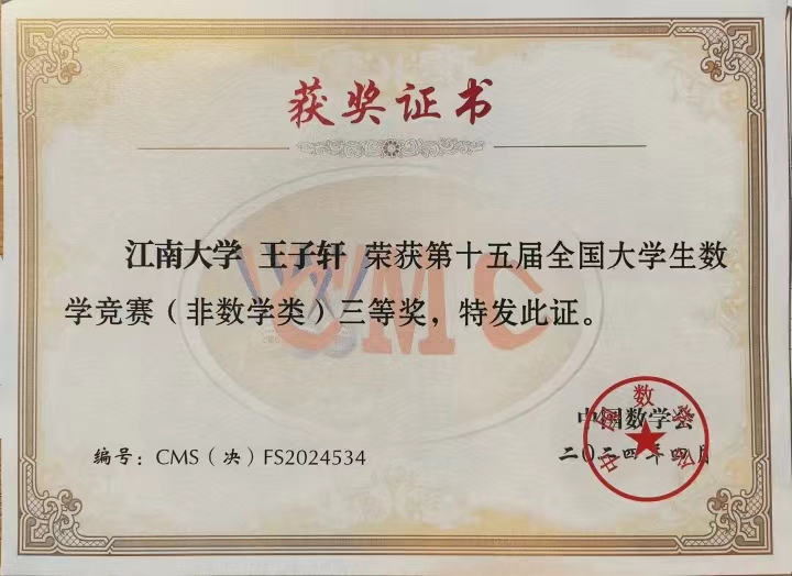 近日,由中国数学会主办、山东大学承办的第十五届全国大学生数学竞赛(决赛)在济南举行。经过激烈角逐,我院学生王子轩在决赛中表现优异,喜获全国三等奖的佳绩。
