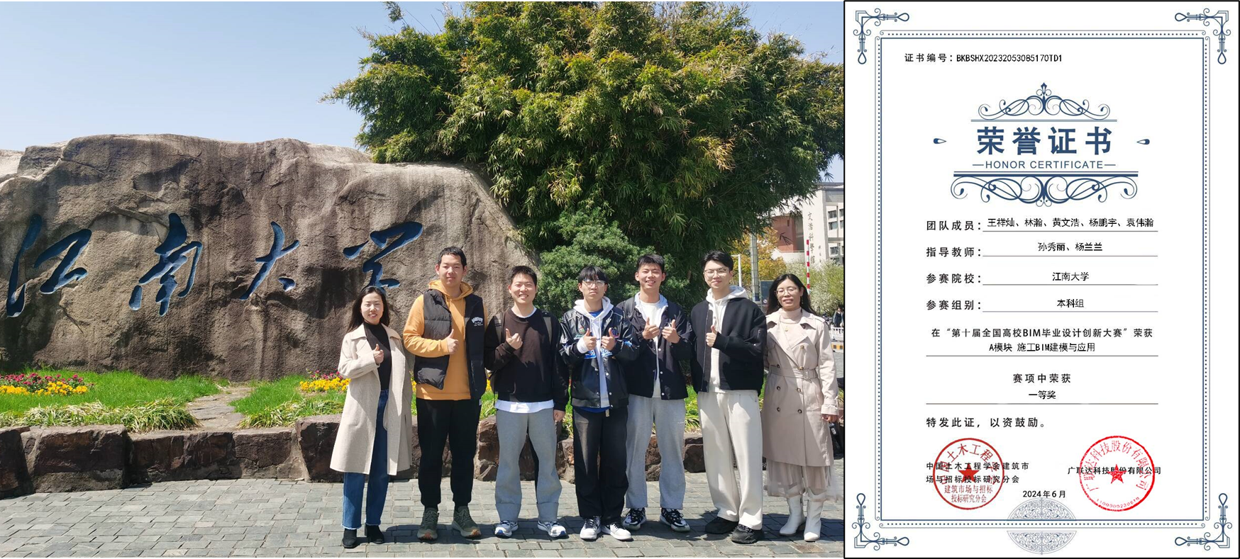 获奖师生合影及一等奖获奖证书