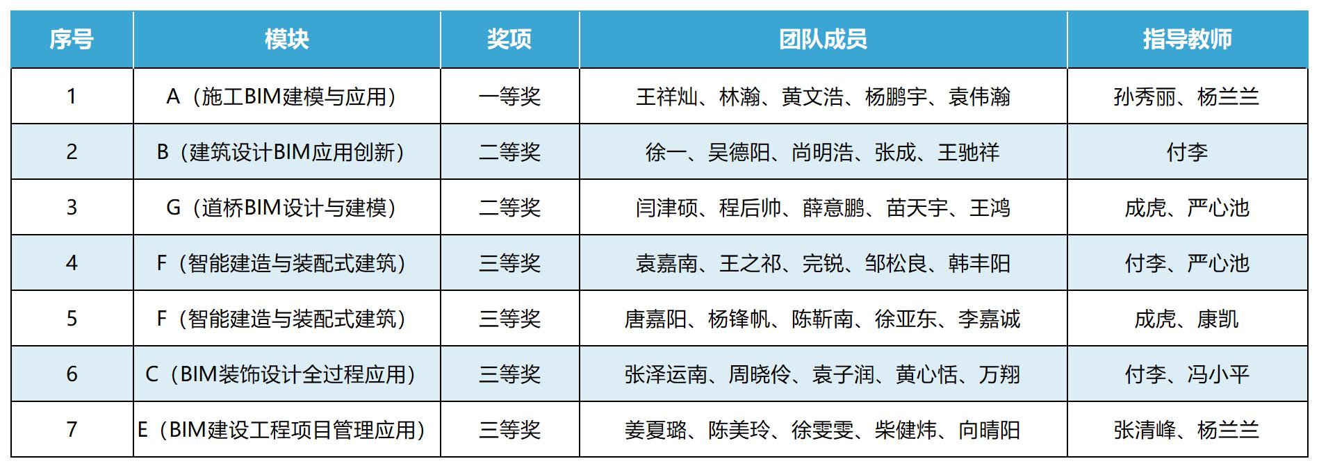 土木工程专业徐一、吴德阳、尚明浩、张成和王驰祥同学荣获B模块(建筑设计BIM应用创新)二等奖,闫津硕、程后帅、薛意鹏、苗天宇和王鸿同学荣获G模块(道桥BIM设计与建模)二等奖,袁嘉南、王之祁、完锐、邹松良和韩丰阳同学,以及唐嘉阳、杨锋帆、陈靳南、徐亚东和李嘉诚同学荣获F模块(智能建造与装配式建筑)三等奖,土木工程专业张泽运南、周晓伶、袁子润和设计学院黄心恬、万翔同学荣获C模块(BIM装饰设计全过程应用)三等奖,土木工程专业姜夏璐、陈美玲、徐雯雯、柴健炜和设计学院向晴阳同学荣获E模块(BIM建设工程项目管理应用)三等奖。