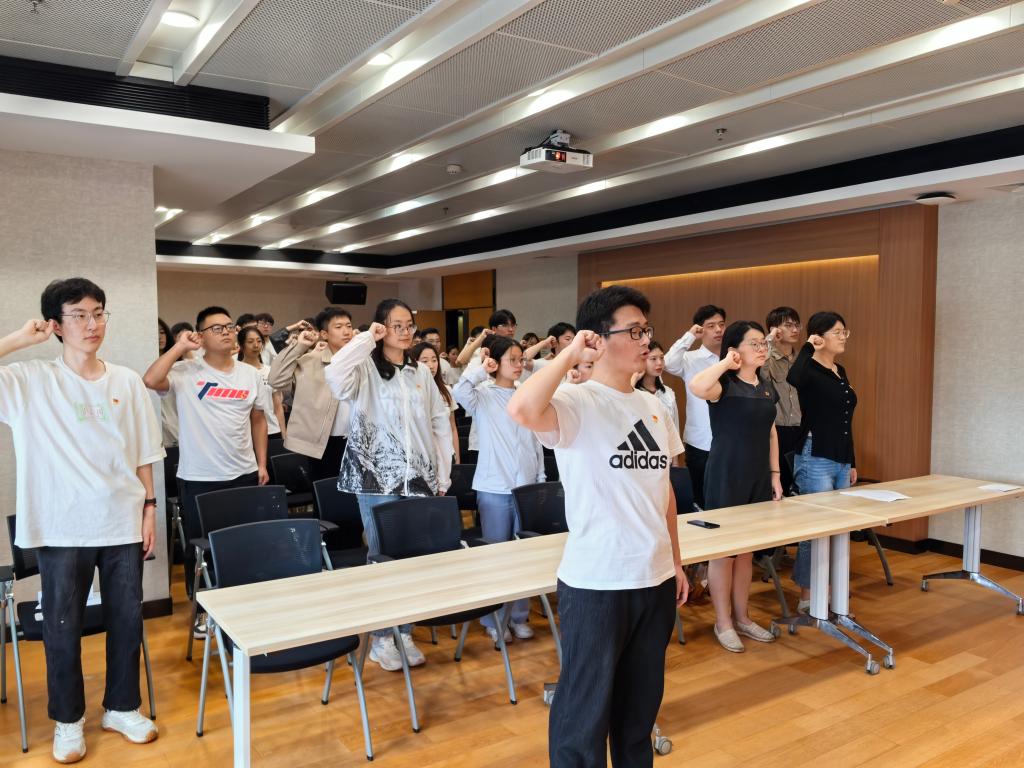 宣誓仪式在庄严的《国际歌》中开始,潘智琦宣读2023-2024学年发展的59名新党员名单,新党员代表刘阳带领全体党员进行入党宣誓。