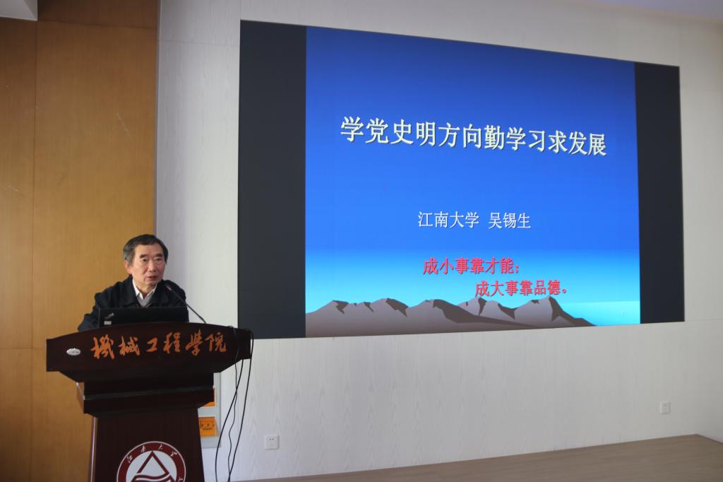 关工委特邀报告员吴锡生讲授党课。他以“学党史明方向勤学习求发展”为题,从总结经验坚定信念、争做合格共产党员、打好基础求得发展三方面展开,系统梳理了中国共产党带领人民建立、建设新中国的历程,分析了党章中规定的八项党员义务,鼓励青年学生立大志、明大德、担大任,为社会主义现代化强国建设添砖加瓦。